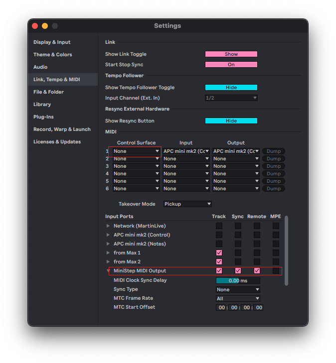 Before launching MiniStep, disable the APCmini mk2 as a control surface in Ableton Live (MIDI preferences → Control Surface → None). Leave the Input and Output set to the device. MiniStep creates its own virtual MIDI port — set your drum instrument to receive from MiniStep MIDI Output.