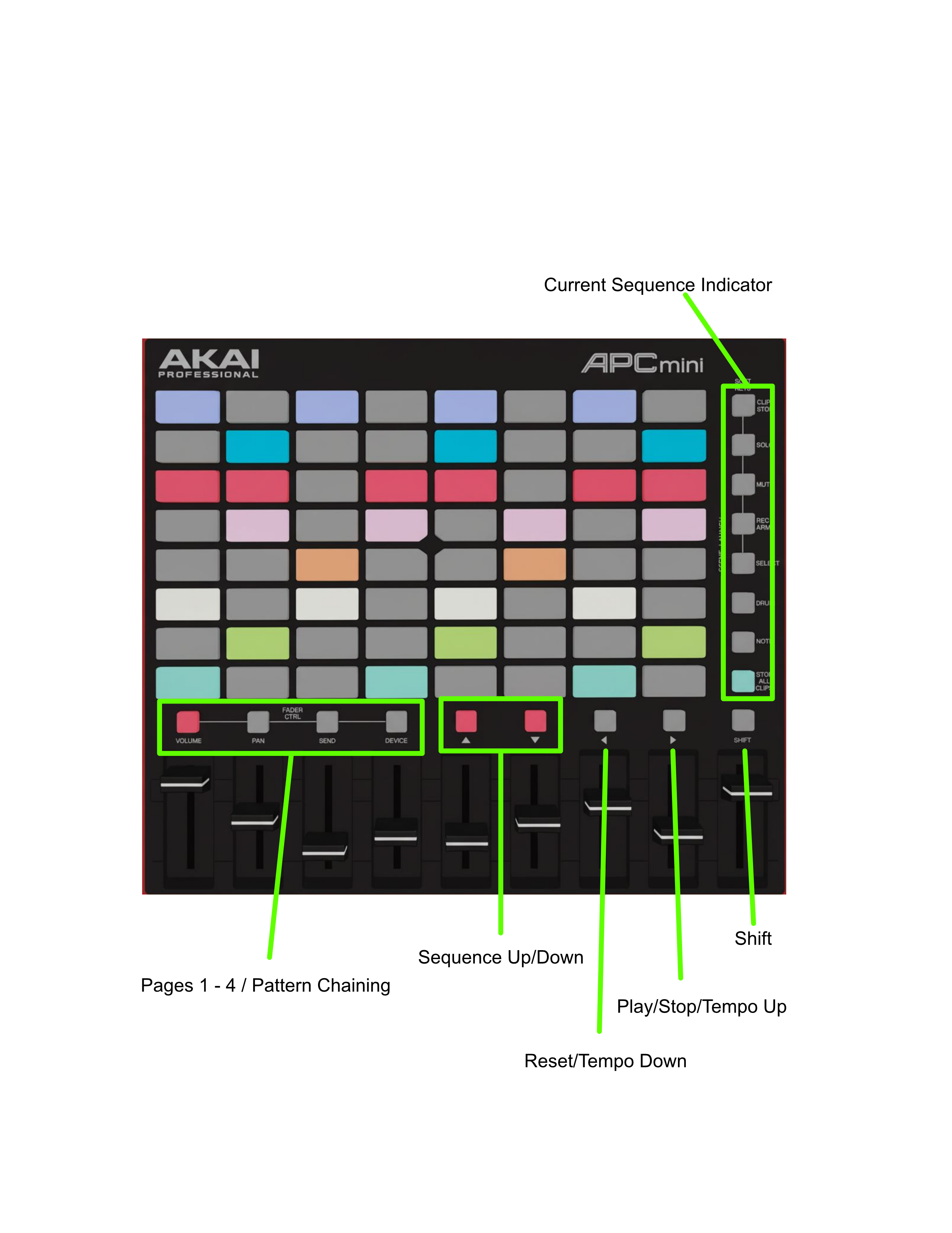 The right-hand column of scene buttons shows which sequence slot is currently loaded. The transport buttons below the grid handle play, stop, reset, and sequence navigation. Shift unlocks a second function on most controls — tempo adjustment, chain mode, and velocity editing.